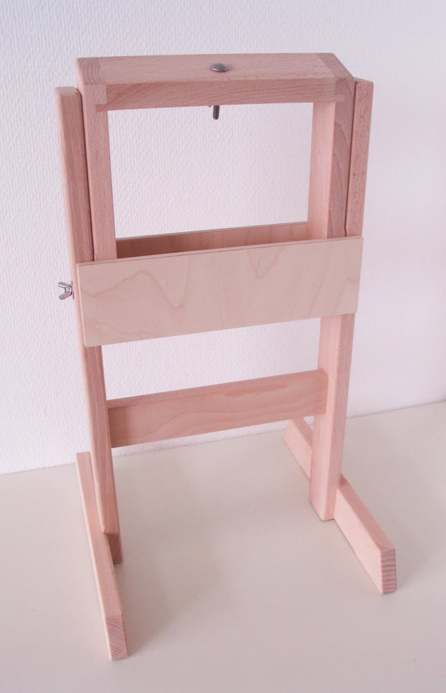 Height-adjustable floor stand for table boxes or flat pillow attachments. With this base you turn your table box into a comfortable floor stand that you can adjust to your needs. The table box or the flat pillow attachment are fastened with a screw and can be turned. You can put spools of thread, scissors or bobbins in the middle section.