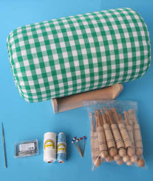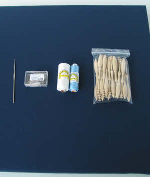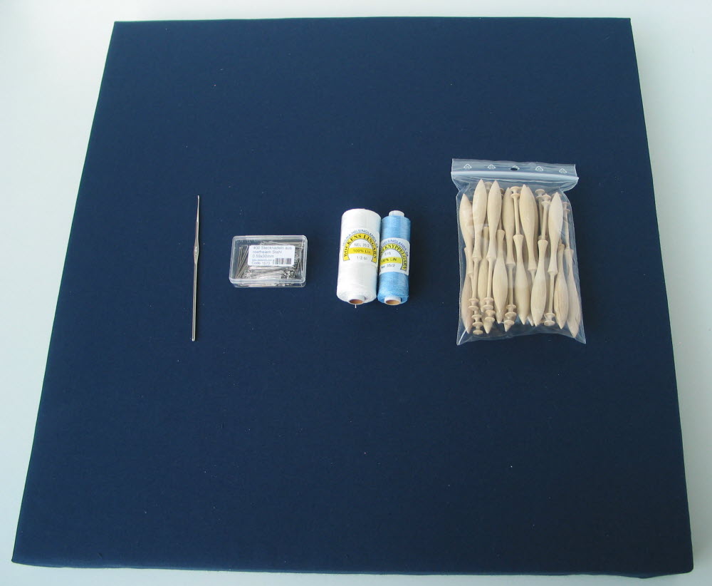 Pour les débutants ou comme deuxième coussin léger, pour les vacannces ou pour un cours de dentelle: le coussin est en Styrodur, recouvert de feutre léger et d'un tissu bleu.